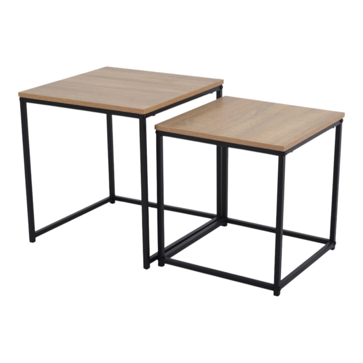 Σετ από 2 τραπέζια με ξύλινη επιφάνεια και μεταλλική μαύρη βάση. Τα τραπεζάκια είναι διαφορετικού μεγέθους που μπορούν να τοποθετηθούν μαζί ή ξεχωριστά. Ο μοντέρνος σχεδιασμός τους επιτρέπει να τοποθετούνται το ένα μέσα στο άλλο για εξοικονόμηση χώρου.
