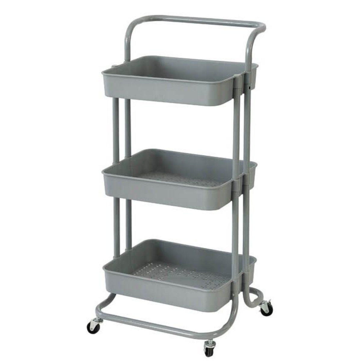 Τρόλεϊ με μεταλλικό σκελετό και τρία πλαστικά καλάθια με διχτυωτό πάτο σε γκρι ματ χρώμα. Διαθέτει μεταλλικό στοπ στις δύο ρόδες και χειρολαβή.
